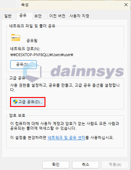 1. 공유할 폴더 마우스 우클릭 → 속성 → 공유 → 고급공유
