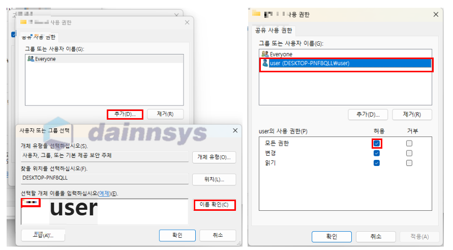 - 선택한 폴더 공유 : 체크 → 권한 → 기존 계정(예시에서는 user) → 이름확인 → user 클릭 → 모든권한 체크 → 적용
