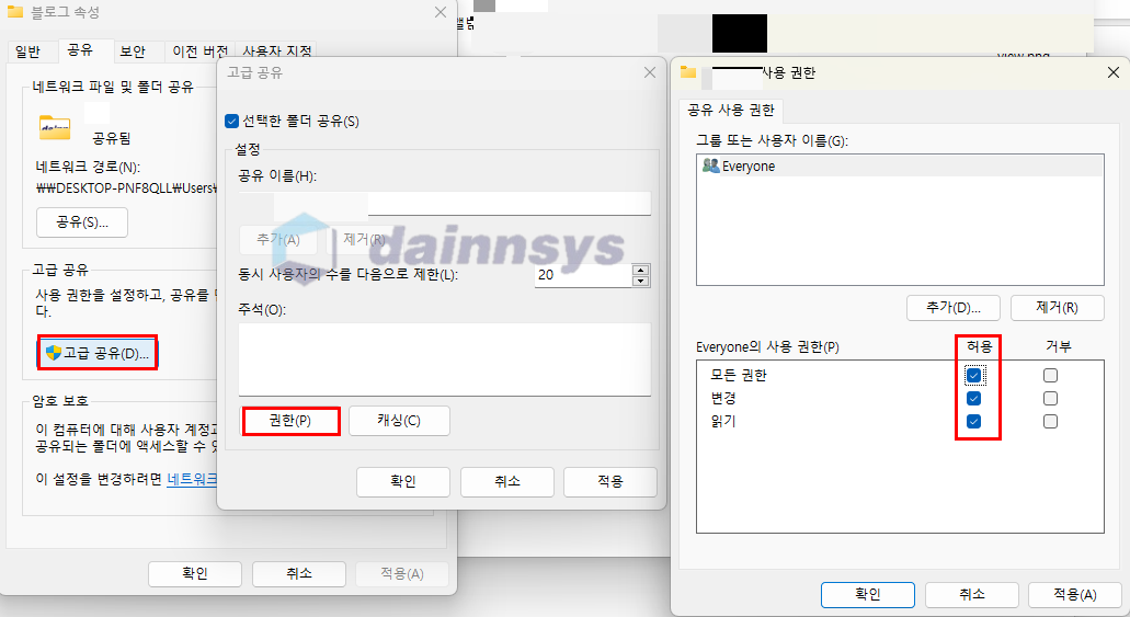 - 선택한 폴더 공유 : 체크 → 권한 → Eceryone(누구나) → 모든권한 체크 → 적용 [ 보안 상관없이 사용 ]