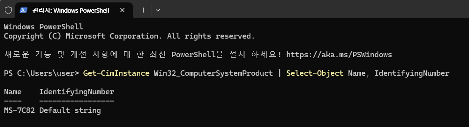 - 방법: gcim Win32_Comp 까지만 치고 Tab을 누르면 자동으로 Win32_ComputerSystemProduct가 완성됩니다.