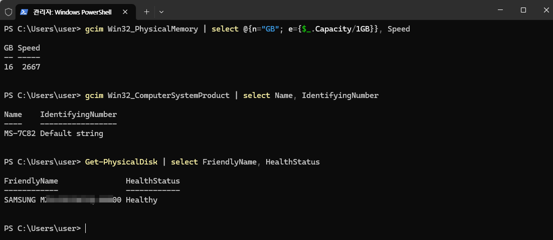 - 모델명 체크: gcim Win32_ComputerSystemProduct | select Name, IdentifyingNumber