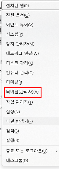 - 단축키: Win + X 키를 누른 후 [터미널(관리자)] 을 클릭합니다.