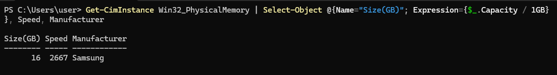 Get-CimInstance Win32_PhysicalMemory | Select-Object @{Name="Size(GB)"; Expression={$_.Capacity / 1GB}}, Speed, Manufacturer