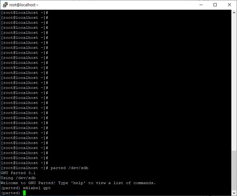 # parted [/dev/sdb] => 괄호는 빼고 작업할 디스크 입력해주시면 됩니다.