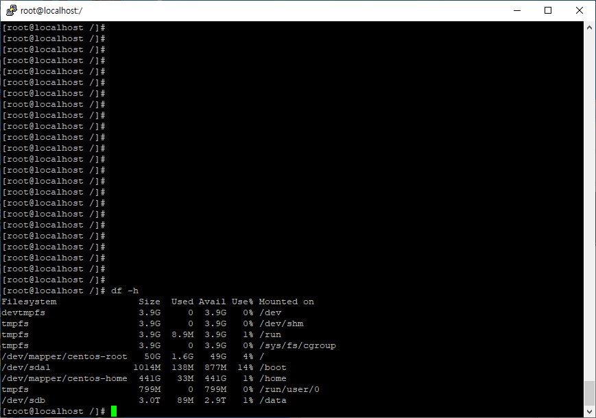 상단의 이미지와 같이 /data라는 디렉토리에 /dev/sdb라는 3TB 디스크가 마운트가 잘된 것을 확인할 수 있습니다.